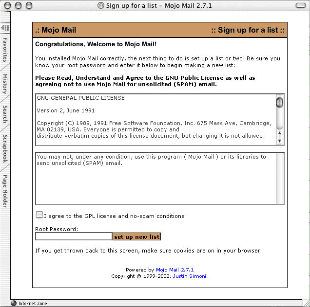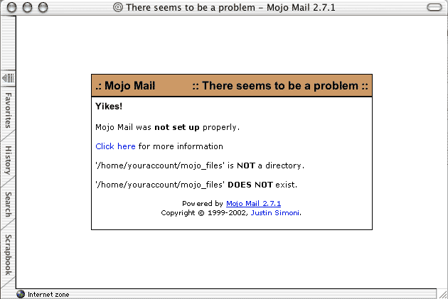 If you see this screen, you are witnessing the first cries of a newly born Mojo Mail installation. Like a baby, it really can't yet care for itself, but it's alive and kickin'. As the parent, it's your job to, for a little while, nurture Mojo Mail.