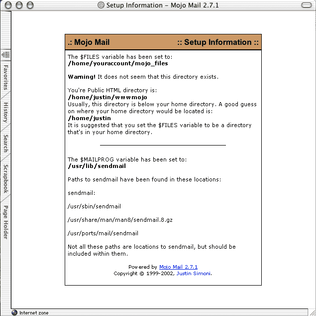One of these bits is your Home Directory. If you don't know your account's home directory (although you really ought to), Mojo Mail tries to give you a good guess. This is very handy if you're working on a server that you are not familiar with. It seems that every server I've encountered, likes to set up things differently.